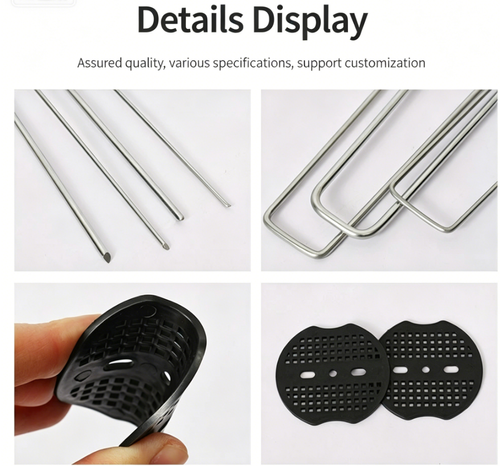 Each set includes 100 U-shaped ground stakes, 100 washers, and 1 stake remover.